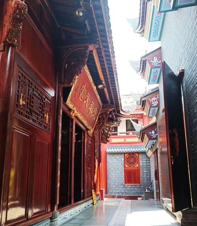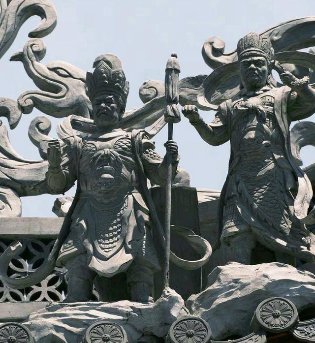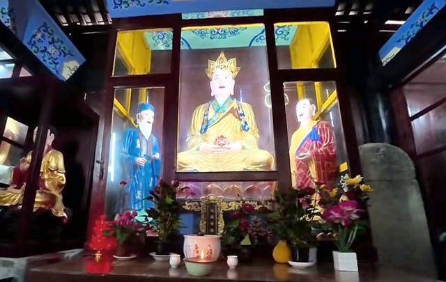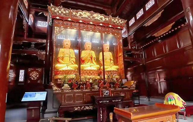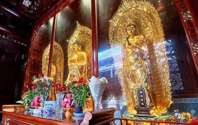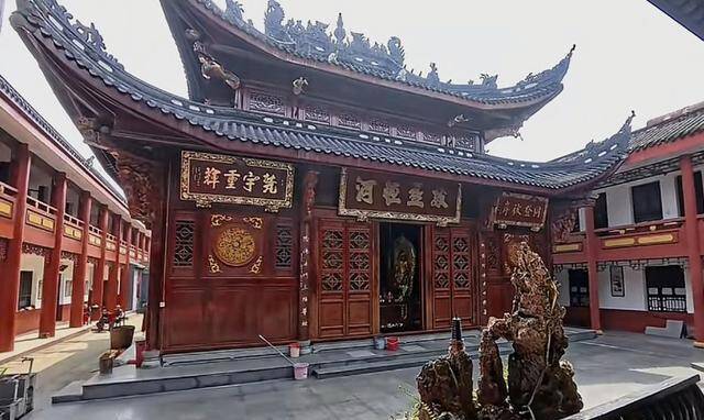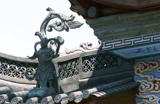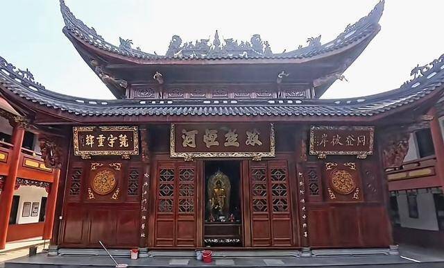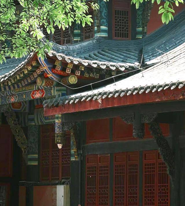 第二重殿是大雄宝殿,重檐歇山顶,抬梁式木结构,飞檐翘角。比起天王殿,更加华丽气派。梁柱、门窗上刻着龙凤、花鸟、祥云,每一处雕刻都精细入微。屋脊上的雕塑也更复杂。正中是二龙戏珠,两边有仙人、走兽。