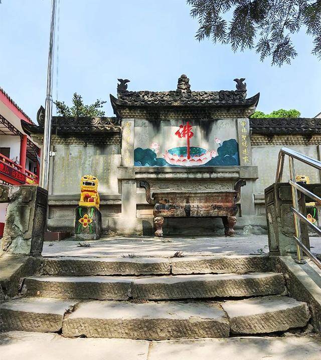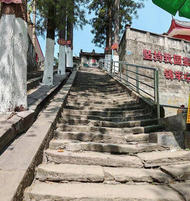 继续往上,又长又陡的青石板石阶,被一排古树一分二,左侧是新维护的石阶,右边是承载岁月的记忆石阶。台阶之上,便来到了寺庙的主要建筑群。照壁之后是山门。