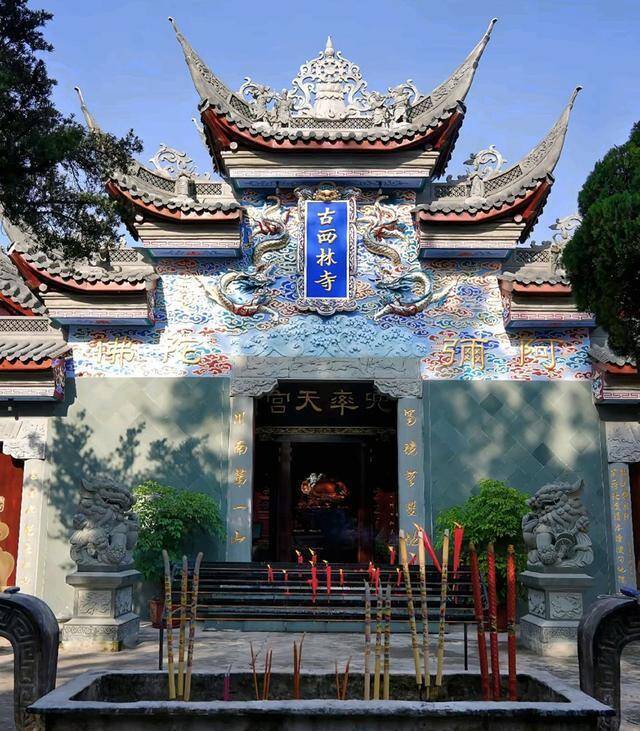 山门以蓝、红为主色调的彩绘华丽夺目,绘有龙纹、祥云等吉祥图案,中央蓝色牌匾上“古西林寺”四个金色大字,门前左右有威武的石狮守护,四周绿树掩映。
