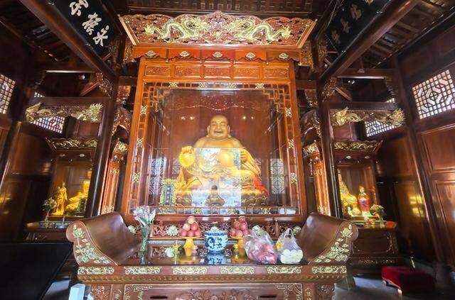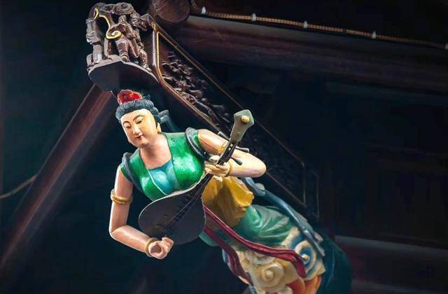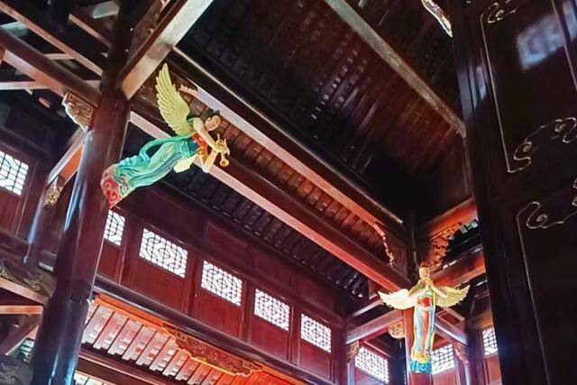 跨过山门,第一重殿是天王殿。殿中供的是笑口常开的弥勒佛。屋顶的翼飞式设计很抢眼——屋檐翘得老高,像要飞起来一样。屋脊上刻着彩色的人物、兽、龙,虽然颜色鲜艳,看起来大气、精美。