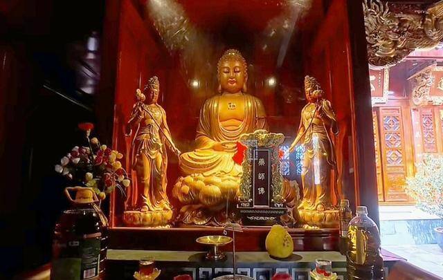殿内供奉着三身佛,中尊是毗卢遮那佛,左尊是卢舍那佛,右尊是释迦牟尼佛。三身佛背面是西方三圣。